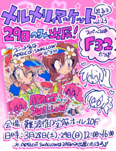 こんにちは、APRICOT SWALLOWです♪ 今回は二週間後の3月28(土)29(日)に開催される、メルメリィマーケットの配置が発表されましたのでお知らせいたします! APRICOT SWALLOWの配置場所は【F3 […]